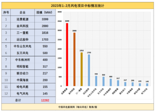 據(jù)每日風電統(tǒng)計,2023年1-2月,59個風電項目的中標情況顯示,已開標項目總規(guī)模達12282MW,涉及12家整機商。