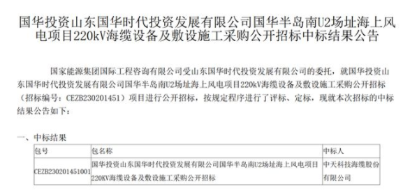 近日,國(guó)家能源招標(biāo)網(wǎng)發(fā)布《國(guó)華投資山東國(guó)華時(shí)代投資發(fā)展有限公司國(guó)華半島南U2場(chǎng)址海上風(fēng)電項(xiàng)目220kV海纜設(shè)備及敷設(shè)施工采購(gòu)公開招標(biāo)中標(biāo)結(jié)果公告》。公告顯示,中天科技海纜股份有限公司成功中標(biāo)該項(xiàng)目,中標(biāo)價(jià)格為42111.942000萬(wàn)元。