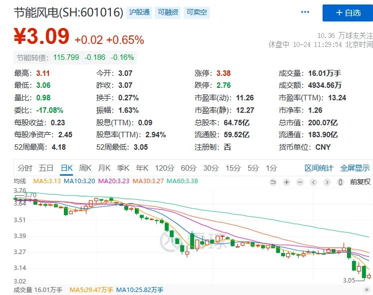 二級(jí)市場(chǎng)上,截至24日午間收盤(pán),節(jié)能風(fēng)電上漲0.65%,報(bào)3.09元/股。
