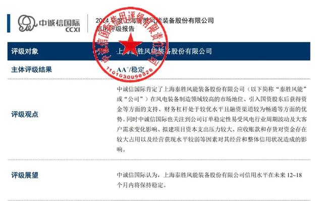 近日,上海泰勝風(fēng)能裝備股份有限公司(以下簡稱“泰勝風(fēng)能”)經(jīng)中誠信國際信用評(píng)級(jí)有限責(zé)任公司(以下簡稱“中誠信”)嚴(yán)格評(píng)審,被授予主體信用等級(jí)“AA+”,評(píng)級(jí)展望穩(wěn)定,成為風(fēng)電行業(yè)風(fēng)電支撐結(jié)構(gòu)第一家“AA+”企業(yè)。