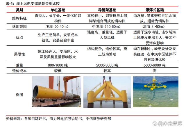 塔筒、樁基是風(fēng)電設(shè)備中的支撐基礎(chǔ)部件,分別用于連接和承載風(fēng)電機組、支撐和固 定整機。風(fēng)電塔筒除塔體外,其內(nèi)部通常有爬梯、電纜梯、平臺等內(nèi)部結(jié)構(gòu),以供風(fēng)電機 組的運營及維護(hù)使用。風(fēng)電支撐基礎(chǔ)分為單樁、導(dǎo)管架和漂浮式基礎(chǔ)三類,淺海區(qū)域中機 組安裝在下端深入海床地基的樁基或?qū)Ч芗苌希珊4驳鼗峁┲?深海區(qū)域中樁基、 導(dǎo)管架有長度限制,無法實現(xiàn)支撐功能,漂浮式基礎(chǔ)主要由浮箱及錨繩組成,浮箱為海上 風(fēng)電機組提供支撐力,并通過錨索或纜繩將塔筒與海底相連,使機組可以在某一相對固定 的區(qū)域內(nèi)自由移動。