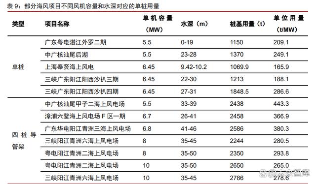 風(fēng)電大型化和深?;苿訕痘?、塔筒單機(jī)用量增長。據(jù)海力風(fēng)電招股書,適用于 0- 24m 水深單機(jī)容量 4MW 的單樁基礎(chǔ)重量在每臺 550-1000 噸之間;水深 30m 以上單機(jī) 容量 5MW 使用的四樁導(dǎo)管架基礎(chǔ)重量為 243 噸。以三峽陽江沙扒三期和三峽陽江青洲六 項(xiàng)目對比測算樁基塔筒單機(jī)用量,陽江沙扒三期安裝單機(jī)容量 6.45MW 風(fēng)機(jī) 62 臺,陽江 青洲六分別安裝 8MW 和 10MW 容量風(fēng)機(jī) 25 和 80 臺,風(fēng)機(jī)葉片直徑、輪轂高度數(shù)值均增 大,單臺塔筒和樁基用量為 734 噸和 2657 噸,較淺水域小容量風(fēng)機(jī)項(xiàng)目對應(yīng)的 380 噸和 1693 噸用量提升。