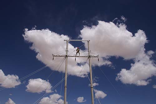 項(xiàng)目架空線路桿塔共計668基,12種桿塔型式。桿塔是在35kV架空線路架設(shè),線路總長度約122.21km,塔高為15-21米,屬于高空作業(yè)。施工現(xiàn)場干旱炎熱,沙塵暴和冰雹也常常輪番“光顧”,給施工進(jìn)度和安全管理帶來不小的挑戰(zhàn)。在桿塔組立作業(yè)前,項(xiàng)目部組織協(xié)作隊伍召開專題安全會,施工隊長徐少帥堅持對現(xiàn)場的施工操作人員進(jìn)行詳細(xì)的安全、技術(shù)、質(zhì)量交底工作;質(zhì)量安全科林周彬堅持每天現(xiàn)場巡查,要求高空作業(yè)人員必須持證上崗,且具有合格的體檢報告;施工過程中,施工現(xiàn)場拉起安全警戒線、懸掛安全警示標(biāo)識,安全員全程旁站監(jiān)督,確?,F(xiàn)場施工安全質(zhì)量可控。
