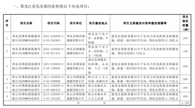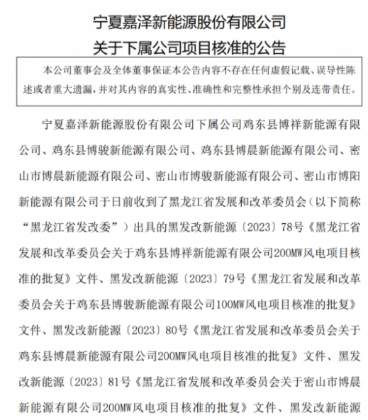 公告披露,寧夏嘉澤新能源股份有限公司下屬公司于日前收到了黑龍江省發(fā)展和改革委員會(以下簡稱“黑龍江省發(fā)改委”)出具的風電項目核準的批復文件,共計六個風電項目獲得核準,總裝機容量為1100MW。