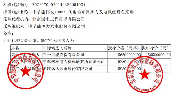 1月28日,中節(jié)能平臺(tái)發(fā)布《中節(jié)能懷安100MW風(fēng)電場(chǎng)項(xiàng)目風(fēng)力發(fā)電機(jī)組設(shè)備采購(gòu)》中標(biāo)候選人公示,三一重能預(yù)中標(biāo),投標(biāo)報(bào)價(jià)15650萬元。