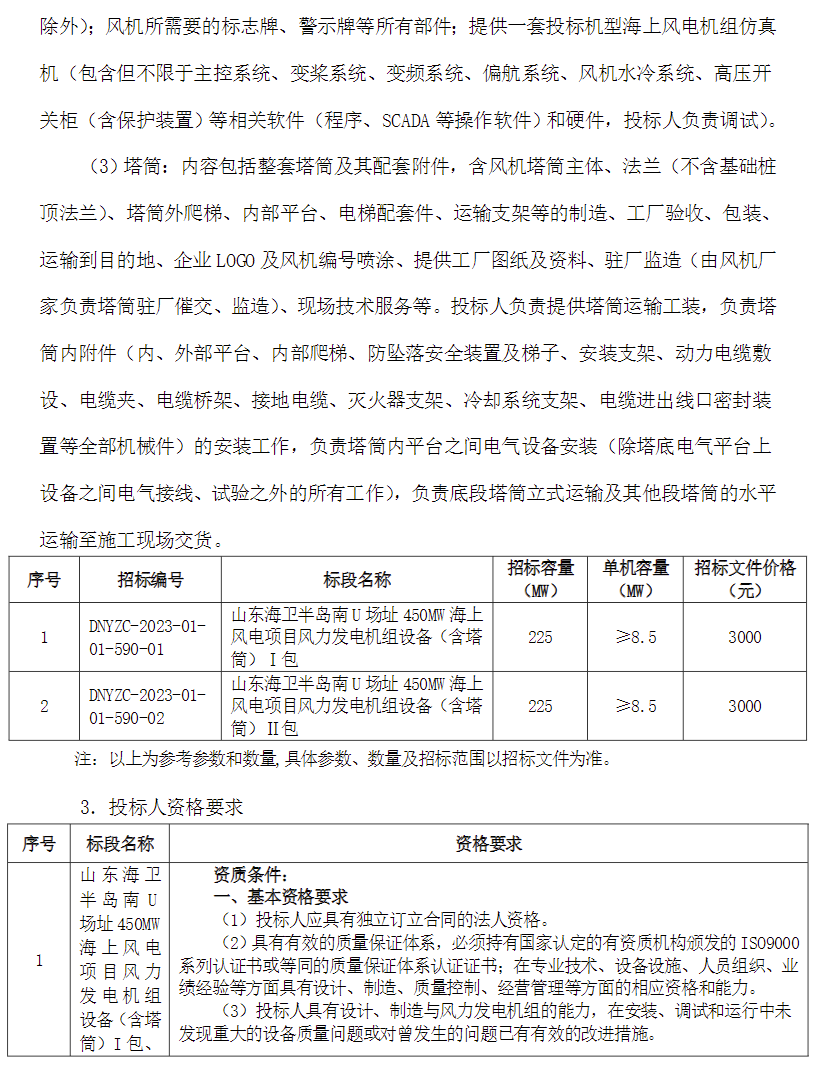 近日,國家電力投資集團有限公司發(fā)布二〇二三年度第六批集中招標(山東海衛(wèi)半島南 U場址 450MW海上風電項目風力發(fā)電機組設備(含塔筒)采購)招標公告,規(guī)模共計450MW,單臺機組容量要求 8.5MW及以上。