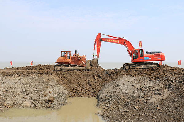 作為應急救援的“國家隊”,常州分公司搶險隊員用鮮紅的“安能色彩”點亮演練現(xiàn)場,隨著現(xiàn)場指揮員一聲令下,參演人員裝備迅速到達任務區(qū)域。針對決口險情,搶險分隊出動挖掘機、推土機、自卸車等重型裝備,采用“機械化立體封堵”戰(zhàn)法,按“穩(wěn)固堤頭、單戧立堵、雙向進占、防滲閉氣”的步驟穩(wěn)步實施,同時救援編隊根據(jù)決口實際科學編配機械、合理編組人員,將裝料、運料、推料工作分層次合理劃分,并根據(jù)機械編組采取“311”模式配備指揮員、觀察員、安全員,全程保證人員安全和指揮精準高效,圓滿完成決口封堵演練任務。針對堤防迎水面滑坡險情,采用挖掘機植樁固腳的方式進行搶護,以“上部削坡、下部固腳”為原則,充分發(fā)揮重型機械快捷高效的特點,高標準完成工程搶險任務。