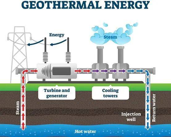 具體操作時(shí),高溫地?zé)猁}水從地表下長達(dá)一英里或更深的儲(chǔ)層中回收。鹽水通過水井上升到地?zé)岚l(fā)電廠,鹽水通過閃蒸產(chǎn)生蒸汽,蒸汽帶動(dòng)渦輪機(jī)旋轉(zhuǎn)發(fā)電。冷卻后的鹽水通過注水井回到同一儲(chǔ)層,在那里重新加熱并重復(fù)使用。