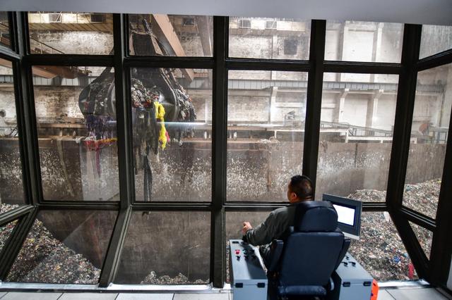 9月19日,在山東啟迪濟(jì)能環(huán)保科技有限公司,工作人員在控制室內(nèi)操作設(shè)備吊運(yùn)垃圾。