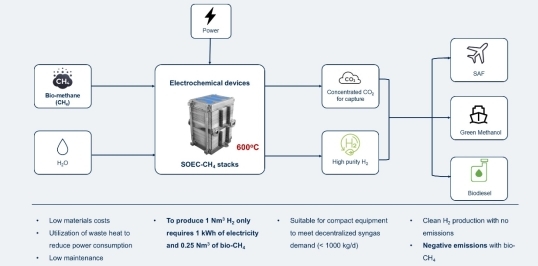 采用更先進(jìn)的電化學(xué)路線,將生物天然氣、綠電、水輸入電堆,在600℃運(yùn)行溫度下,同時(shí)產(chǎn)出高純度綠氫和自富集的CO2,一次性解決綠色燃料合成時(shí)的兩大重點(diǎn)原料的來(lái)源問(wèn)題。不僅簡(jiǎn)化了流程,更縮減了成本。在其他項(xiàng)目仍在使用其他電解水制氫裝備,以3-5度/標(biāo)方的電耗制取綠氫,同時(shí)增設(shè)空氣捕集裝置來(lái)捕集CO2時(shí)。電堆科技已經(jīng)做到,制取1標(biāo)方氫氣,僅需1度電及0.25標(biāo)方生物天然氣,且無(wú)需增設(shè)空氣捕集裝置。