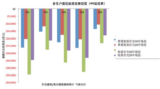 通過計算多住戶建筑平均用能支出和低效住宅建筑用能支出,落基山研究所以4%貼現(xiàn)率對比了多住戶建筑用能支出的現(xiàn)值。我們發(fā)現(xiàn),凈零排放改造最具經(jīng)濟(jì)吸引力的區(qū)域是第1氣候區(qū)域,第4區(qū)緊隨其后。