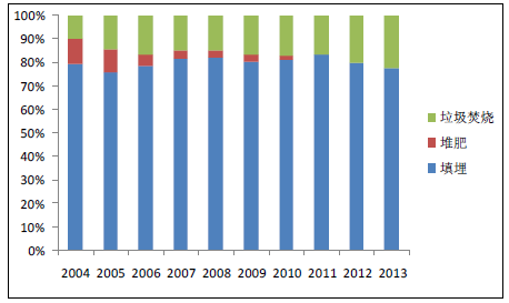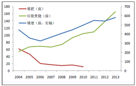 垃圾焚燒可以快速處理堆積成山的垃圾,有效減小垃圾的體積50%-90%,同時通過焚燒發(fā)電, 既解決了垃圾填埋的占地、污染問題,又實現(xiàn)了能源的清潔回收利用。目前,我國城市生活垃圾累積堆存量已達70 億噸,據(jù)國家統(tǒng)計局數(shù)據(jù)顯示,截止2013 年我國生活垃圾填埋比例占68.2%, 垃圾焚燒僅占30.1%。