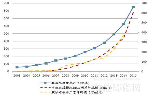 市政大規(guī)模MBR應(yīng)用和膜法市政水廠規(guī)模變化與膜法水處理行業(yè)產(chǎn)值變化趨勢高度一致