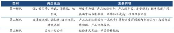 國內(nèi)膜法水處理行業(yè)公司可劃分為國際領(lǐng)先企業(yè),國內(nèi)領(lǐng)先企業(yè)和國內(nèi)小型企業(yè)三個梯隊(duì)