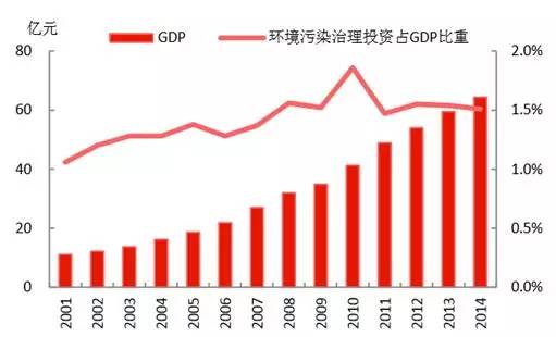 從國家統(tǒng)計局的數(shù)據(jù)可以看到,我國在環(huán)境污染治理方面的投資量,呈現(xiàn)上升趨勢,2014年達(dá)到9576億元;近年占GPD的比重維持在1.5%左右,較2001年提升約0.5個百分點(diǎn)。發(fā)改委、環(huán)保部印發(fā)《關(guān)于培育環(huán)境治理和生態(tài)保護(hù)市場主體的意見》,提出目標(biāo),“十三五”綠色環(huán)保產(chǎn)業(yè)產(chǎn)值年均增長15%以上,遠(yuǎn)高于CDP的增長目標(biāo),為經(jīng)濟(jì)增長注入動力。