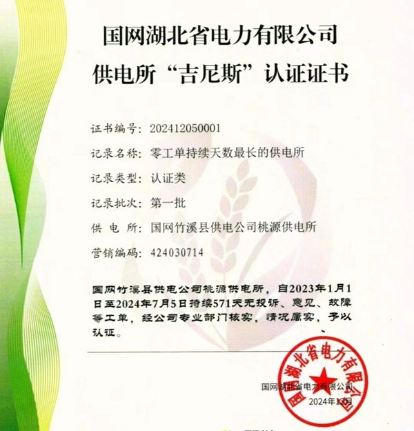 中國電力網(wǎng)訊(通訊員 黃耀成、郭旭) 日前,從國網(wǎng)湖北省電力有限公司傳來喜訊,繼去年國網(wǎng)竹溪縣供電公司匯灣供電所喜獲國網(wǎng)十堰供電公司“四星級鄉(xiāng)鎮(zhèn)供電所”授牌后,今年國網(wǎng)竹溪縣供電公司桃源供電所又獲國網(wǎng)湖北省電力有限公司頒發(fā)的零工單位持續(xù)天數(shù)最長的供電所“吉尼斯”認證證書,這是該公司強化從業(yè)紀律,擦亮服務(wù)窗口,電業(yè)清風為民的真實寫照。