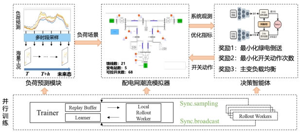 國(guó)網(wǎng)浙江省電力有限公司紹興供電公司聚焦清潔能源消納優(yōu)化控制和負(fù)載均衡目標(biāo),聯(lián)合浙江思極和阿里云等公司一起訓(xùn)練電力調(diào)度人工智能導(dǎo)航員——“調(diào)度智能體”。采用阿里云“云邊一體”數(shù)字化基礎(chǔ)設(shè)施和強(qiáng)化學(xué)習(xí)AI 核心產(chǎn)品,結(jié)合源網(wǎng)荷儲(chǔ)示范工程,從“網(wǎng)”的適應(yīng)性角度提出新能源消納通道靈活調(diào)節(jié)的思路,采用分布式近端策略?xún)?yōu)化(PPO)為核心算法,通過(guò)預(yù)測(cè)抽樣+潮流仿真+強(qiáng)化學(xué)習(xí)訓(xùn)練迭代,生成地區(qū)主、配網(wǎng)方式調(diào)節(jié)策略,實(shí)現(xiàn)示范區(qū)域內(nèi)電網(wǎng)運(yùn)行方式面向新能源消納的自適應(yīng)調(diào)節(jié)。