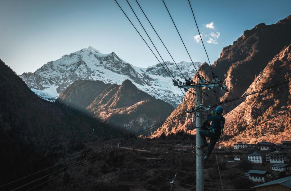 收到村民反映停電故障后,旺登一行立即開展檢查,發(fā)現(xiàn)故障出現(xiàn)在雨崩上村2號臺區(qū),且需要爬上12米高的電線桿進(jìn)行作業(yè)。只見旺登綁緊安全帶,戴上絕緣手套,踩實(shí)腳扣,并進(jìn)行簡短的沖擊試驗(yàn)。隨后,他雙手扶住桿體,左腳穩(wěn)穩(wěn)地扣住,接著右腳向上提,一步一步交叉著往上。