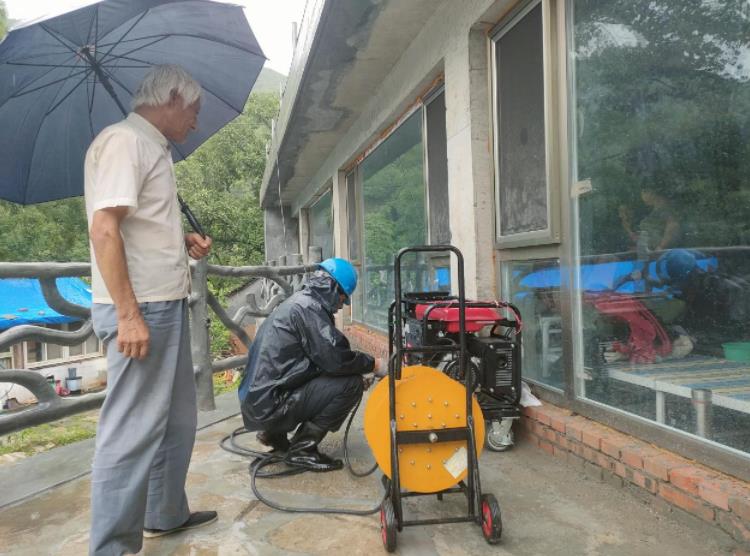 當(dāng)天中午,趁著地區(qū)雨量減弱的空隙,國(guó)網(wǎng)北京房山供電公司周口店供電所所長(zhǎng)康福填和營(yíng)配二班班長(zhǎng)高春耕、營(yíng)配一班組長(zhǎng)袁樹(shù)立、營(yíng)配一班組員張利一起,攜帶應(yīng)急發(fā)電機(jī),在確保安全的前提下緊急趕往20多公里外的北下寺村。距離目的地只有約1公里時(shí),夾括河邊上的道路積水越來(lái)越多,部分路面被沖毀,搶修車(chē)已無(wú)法前進(jìn)。