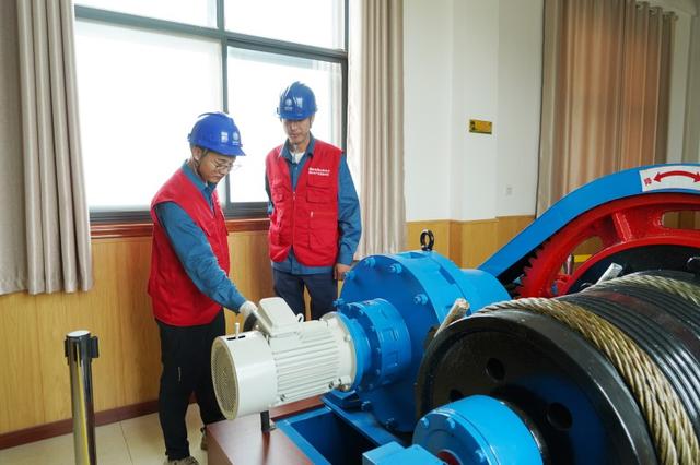 國家電網(wǎng)山東電力彩虹共產(chǎn)黨員服務(wù)隊(duì)隊(duì)員檢查許家崖水庫泄洪機(jī)組運(yùn)行情況。
