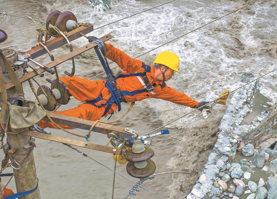 綿陽(yáng)供電公司增援平武縣電網(wǎng)搶險(xiǎn)人員搶修10千伏黃羊線受損線路,于7月27日19時(shí)恢復(fù)線路供電。田海 攝