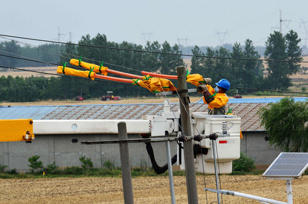 6月8日下午,檢修建設工區(qū)帶電作業(yè)工作人員來到陳廟村一級泵站,開展帶電解、搭專變10千伏引下線作業(yè),快速消除了專變10千伏引下線老化隱患,為泵站提灌抗旱提供了充足的動力和安全保障。