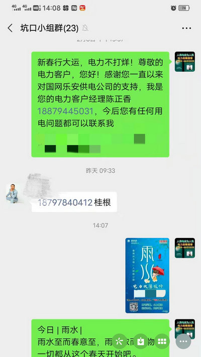 隨著智能通信時(shí)代的來臨,微信這一網(wǎng)絡(luò)軟件已成為人們重要的日常交流工具,通過微信群和客戶溝通交流,既省時(shí)省力,又方便快捷,有效地拉近了雙方的距離。為了更好地開展供電服務(wù)工作,樂安縣公司臺區(qū)客戶經(jīng)理早前就已經(jīng)自建或主動加入管理區(qū)域的村委、社區(qū)微信群,隨時(shí)將停電信息、線路搶修、電費(fèi)回收、節(jié)約和安全用電知識等信息在群中公告和提醒。同時(shí),客戶也可以通過微信群@客戶經(jīng)理,咨詢用電服務(wù)、了解供電信息、反映用電問題,在第一時(shí)間獲得供電服務(wù)。