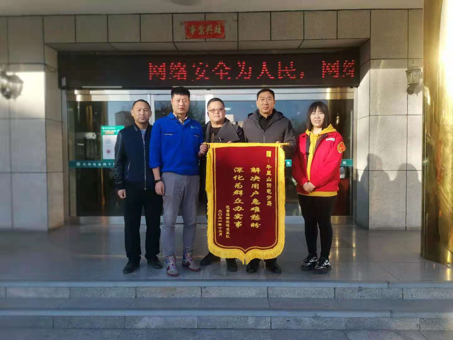 中國電力網(wǎng)訊 近日,烏海市巴音溫都爾嘎查五隊物業(yè)公司宋經(jīng)理及村民何茂將一面印有“解決用戶用戶急難愁盼、深化為群眾辦實事”的錦旗送到烏海市千里山供電分公司副經(jīng)理默日根、俞佳麗的手中,感謝該公司在巴音溫都爾嘎查五隊用電的辦理過程中給予的大力支持和優(yōu)質、高效的供電服務。