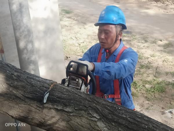 在現(xiàn)場(chǎng),工作電鋸的呲呲聲、斧頭的敲打聲、腳扣攀登電桿的噠噠聲......每位工作人員全然顧不上天氣的悶熱,井然有序的全身心投入,“高空”開展伐樹、修剪作業(yè),不一會(huì)汗水就濕透了衣背。