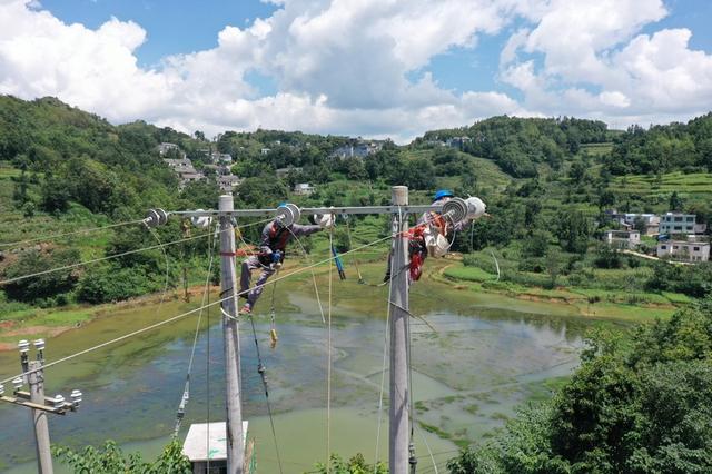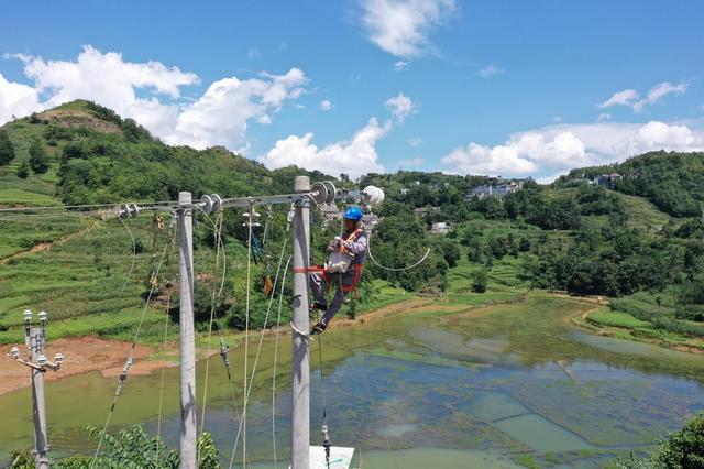 南方電網(wǎng)興仁供電局工作人員對新田水庫供電線路10千伏龍麻線白墳支線進(jìn)行遷改搭線。