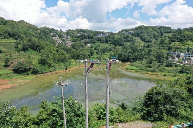 南方電網(wǎng)興仁供電局工作人員對新田水庫10千伏龍麻線新田支線線纜進(jìn)行緊線操作。