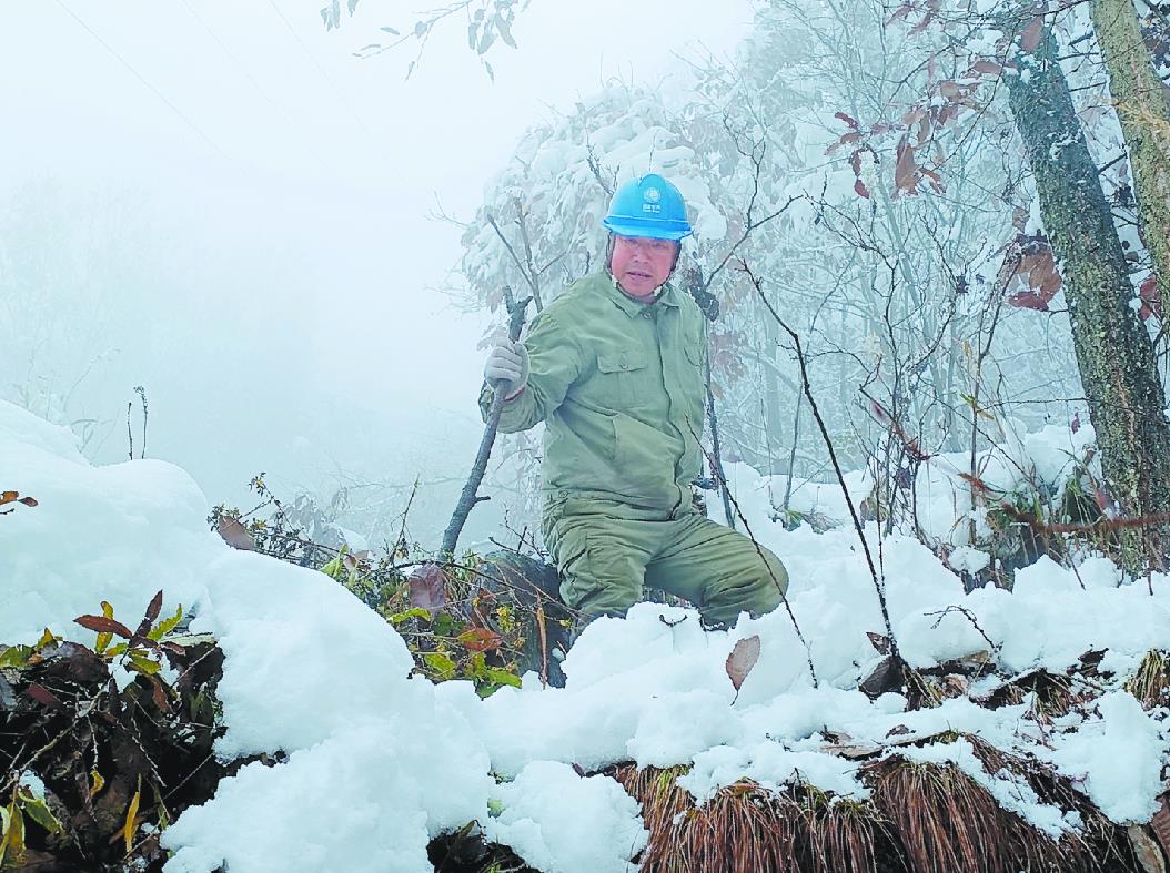 國(guó)網(wǎng)鄖西縣供電公司員工借助樹木拐杖巡視易覆冰區(qū)段線路。