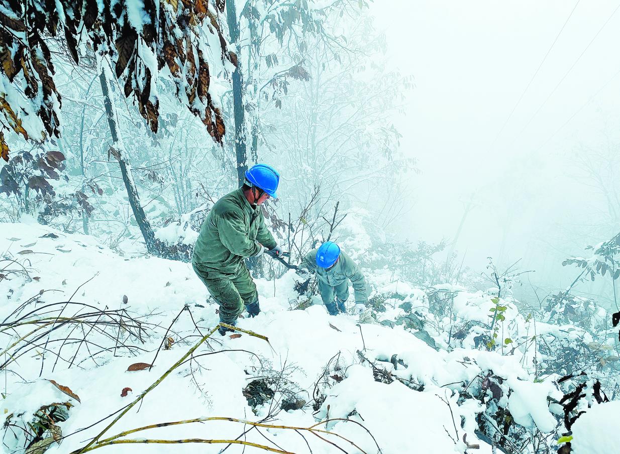 國(guó)網(wǎng)鄖西縣供電公司員工在齊膝深的積雪中艱難跋涉,清理線下覆冰嚴(yán)重的樹木隱患。