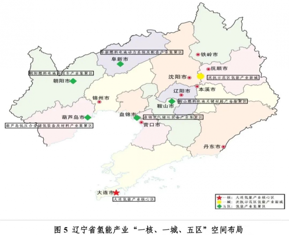 根據(jù)遼寧省現(xiàn)有氫能產(chǎn)業(yè)發(fā)展基礎(chǔ),以“合理集聚、產(chǎn)業(yè)協(xié)同、政企聯(lián)動(dòng)、互為支撐”為原則進(jìn)行空間布局和優(yōu)化,著力構(gòu)建“一核、一城、五區(qū)”的氫能產(chǎn)業(yè)空間發(fā)展格局。一核即大連氫能產(chǎn)業(yè)核心區(qū),一城即沈撫示范區(qū)氫能產(chǎn)業(yè)新城,五區(qū)分別是鞍山燃料電池關(guān)鍵材料產(chǎn)業(yè)集聚區(qū)、朝陽(yáng)燃料電池商用車(chē)產(chǎn)業(yè)集聚區(qū)、阜新燃料電池動(dòng)力系統(tǒng)及配套產(chǎn)業(yè)集聚區(qū)、葫蘆島低壓合金儲(chǔ)氫裝備及材料產(chǎn)業(yè)集聚區(qū)和盤(pán)錦氫氣儲(chǔ)運(yùn)裝備產(chǎn)業(yè)集聚區(qū)。