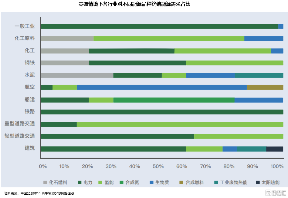 我們可以參考中國氫能聯(lián)盟研究院的數(shù)據(jù)。上圖是在零碳狀態(tài)下,各個行業(yè)終極的能源來源。在化工原料、化工、鋼鐵、重型交通運輸?shù)刃袠I(yè),氫能都是絕對的第一主力。即使在那些電力絕對主導的行業(yè),氫能可能也是其電力的重要來源。