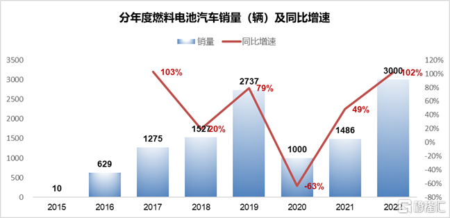 隨后市場就給了這些蜂擁而至的先驅(qū)們當頭一棒,大家立馬“人間清醒”。疫情帶來的對客車以及各類公共用途專用車的需求下降,氫燃料汽車需求直接腰斬,2020年只有1000輛,直到2022年銷量才恢復到3000輛的規(guī)模。