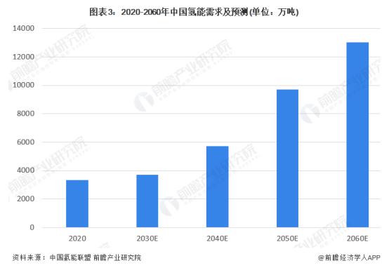 根據(jù)中國氫能聯(lián)盟的預(yù)測,2020 年以后中國氫能需求將持續(xù)增加,尤其是 2030 年以后,為達(dá)成 " 碳中和、碳達(dá)峰 " 的目標(biāo),氫能需求量將大增。到 2060 年,中國氫能年需求將超過 1.3 億噸。