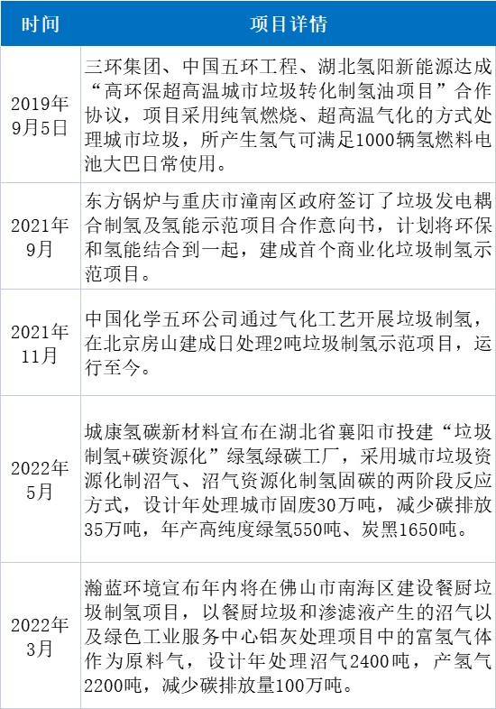 國(guó)內(nèi)而言,主要以環(huán)保企業(yè)、頗具實(shí)力的上市公司開拓業(yè)務(wù)為主。三環(huán)集團(tuán)、瀚藍(lán)環(huán)境、中國(guó)化學(xué)、東方鍋爐等陸續(xù)從2019年開始布局垃圾制氫項(xiàng)目。詳情如下: