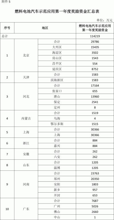 根據(jù)公示文件,第一年度共有10個省級行政區(qū)獲得燃料電池車示范應用獎勵資金,其中北京29786萬元、天津1583萬元、河北17164萬元、內蒙古1519萬元、上海30366萬元、浙江884萬元、安徽262萬元、山東1205萬元、河南23763萬元、廣東7687萬元,總計114219萬元。