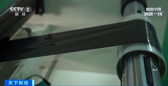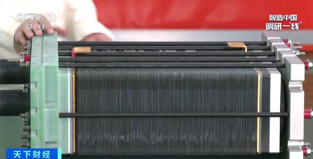 一條產(chǎn)線正在進(jìn)行膜電極的生產(chǎn),制作過程就是將催化劑均勻涂在質(zhì)子交換膜的兩側(cè)。這條產(chǎn)線的催化劑只有3微米厚,相當(dāng)于正常頭發(fā)絲的二十分之一。它可以使生產(chǎn)的膜電極更薄、重量更輕,從而降低整個電堆的厚度,提高功率。目前,這條產(chǎn)線可以實現(xiàn)每天生產(chǎn)1萬片膜電極。