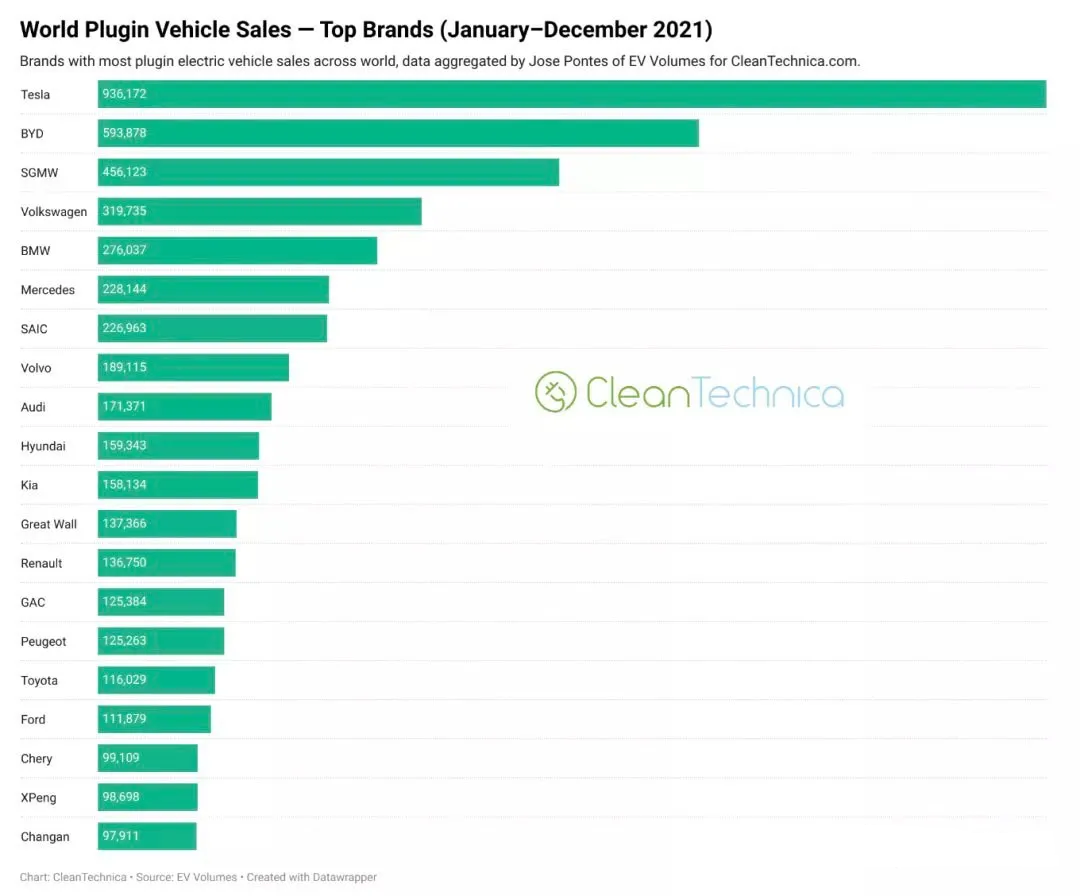 其中,中國品牌8家分別為比亞迪、上汽集團(tuán)、上汽乘用車、長城歐拉、廣汽埃安、奇瑞集團(tuán)、小鵬汽車以及長安汽車。比亞迪以59.39萬輛的銷量排名第2,實(shí)現(xiàn)了超過220%的同比增長,全球市場份額達(dá)9.1%。上汽集團(tuán)以45.61萬輛的銷量排名第3名。上汽乘用車以22.70萬輛的銷量排名第7名。長城歐拉以13.74萬輛的銷量排名第12名。廣汽埃安以12.54萬輛的銷量排名第14名。奇瑞集團(tuán)以9.91萬輛的銷量排名第18名。小鵬汽車以9.86萬輛的銷量排名第19名,小鵬P7車型銷量創(chuàng)下歷史新高,也是其首次進(jìn)入年度前20名。長安汽車以9.79萬輛的銷量排名第20名。