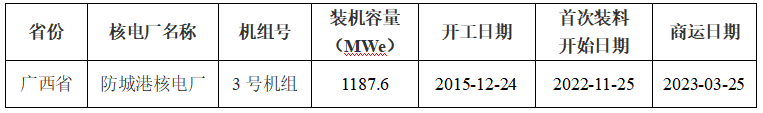 1)防城港核電廠3號機(jī)組2023年3月25日商運(yùn),機(jī)組2023年調(diào)試期間累計(jì)發(fā)電量、上網(wǎng)電量分別為8.02413億度、7.47180億度。
