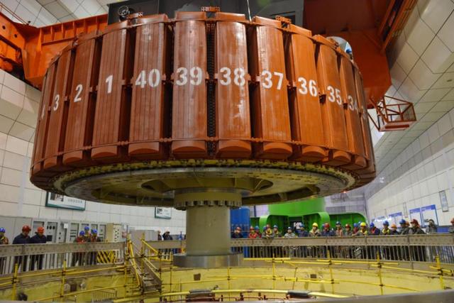 上午8時(shí)58分,新轉(zhuǎn)子起吊工作開始,通過三起三落試吊后,正式起吊、平移,從安裝場支墩緩緩升起,向1號機(jī)坑處平穩(wěn)移去。到達(dá)機(jī)坑上方后,經(jīng)過準(zhǔn)確的中心調(diào)整,轉(zhuǎn)子緩慢下落,間隙監(jiān)測員們手持間隙墊條在轉(zhuǎn)子與定子之間的氣隙中移動(dòng),確保吊入過程中氣隙正常,平穩(wěn)吊入預(yù)定位置。