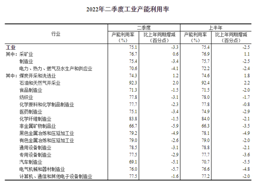 分三大門類看,二季度,采礦業(yè)產(chǎn)能利用率為76.7%,比上年同期上升0.6個百分點(diǎn);制造業(yè)產(chǎn)能利用率為75.4%,下降3.4個百分點(diǎn);電力、熱力、燃?xì)饧八a(chǎn)和供應(yīng)業(yè)產(chǎn)能利用率為70.6%,下降4.1個百分點(diǎn)。