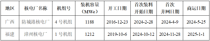1)漳州核電廠1號機組2024年10月12日裝料,本表格中發(fā)電量及上網(wǎng)電量數(shù)據(jù)為調(diào)試期間電量,能力因子暫無數(shù)據(jù)。