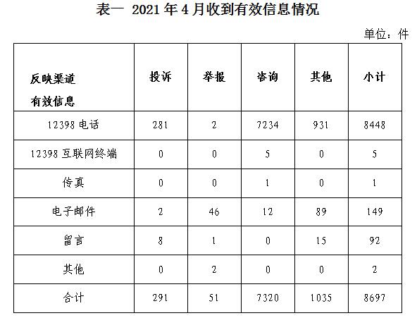 2021年4月,國(guó)家能源局12398能源監(jiān)管熱線(以下簡(jiǎn)稱12398熱線)共收到有效信息8697件(包含投訴、舉報(bào)、咨詢和其他訴求類別),環(huán)比增加3.13%,同比減少1.43%。(2021年4月收到有效信息情況見表一)
