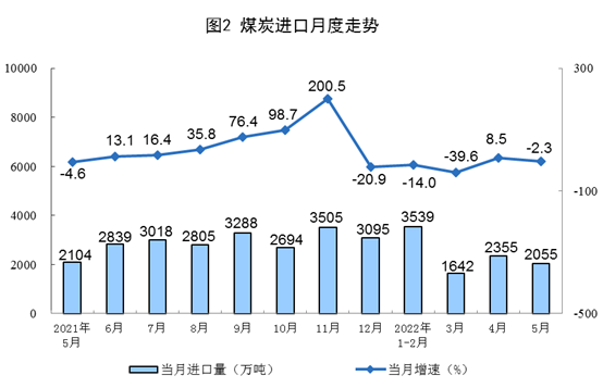 原煤生產(chǎn)保持較快增長,進(jìn)口由增轉(zhuǎn)降。隨著煤炭保供穩(wěn)價政策深入推進(jìn),原煤生產(chǎn)繼續(xù)保持較快增長。5月份,生產(chǎn)原煤3.7億噸,同比增長10.3%,增速比上月放緩0.4個百分點,日均產(chǎn)量1187萬噸。進(jìn)口煤炭2055萬噸,同比下降2.3%,上月為增長8.5%。