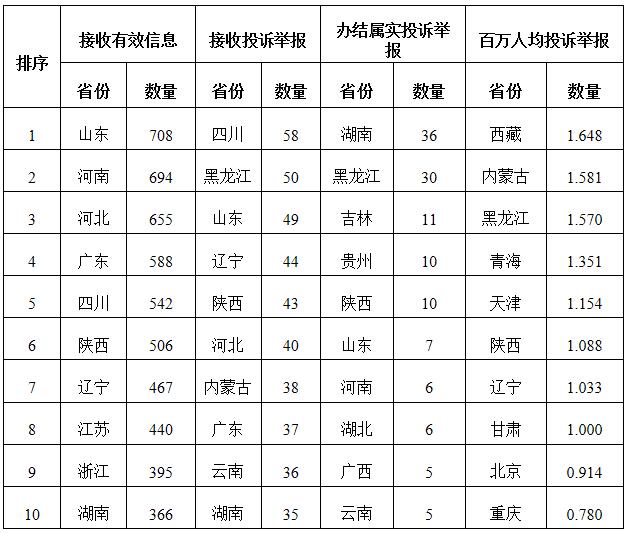 各省(自治區(qū)、直轄市)按照接收的有效信息數(shù)量排序,山東、河南、河北、廣東、四川、陜西、遼寧、江蘇、浙江、湖南排在全國前10位;按照接收的投訴舉報數(shù)量排序,四川、黑龍江、山東、遼寧、陜西、河北、內(nèi)蒙古、廣東、云南、湖南排在全國前10位;按照辦結(jié)屬實的投訴舉報數(shù)量排序,湖南、黑龍江、吉林、貴州、陜西、山東、河南、湖北、廣西、云南排在全國前10位;按照百萬人均投訴舉報數(shù)量排序,西藏、內(nèi)蒙古、黑龍江、青海、天津、陜西、遼寧、甘肅、北京、重慶排在全國前10位。(2022年4月有效信息及投訴舉報排名前10位情況見表三)