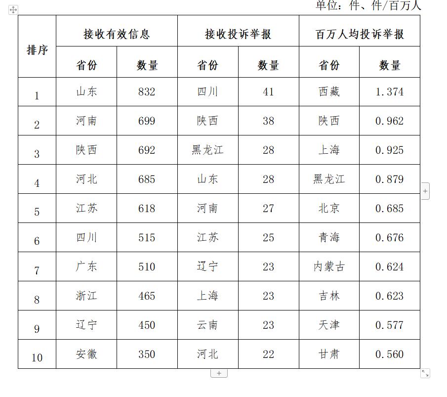 各省(自治區(qū)、直轄市)按照接收的有效信息數(shù)量排序,山東、河南、陜西、河北、江蘇、四川、廣東、浙江、遼寧、安徽排在全國前10位;按照接收的投訴舉報數(shù)量排序,四川、陜西、黑龍江、山東、河南、江蘇、遼寧、上海、云南、河北排在全國前10位;按照百萬人均投訴舉報數(shù)量排序,西藏、陜西、上海、黑龍江、北京、青海、內(nèi)蒙古、吉林、天津、甘肅排在全國前10位。(2023年2月有效信息及投訴舉報排名前10位情況見表三)