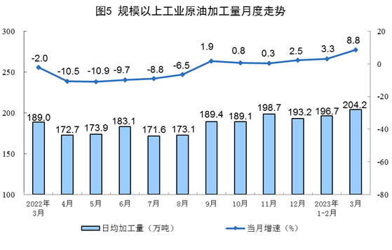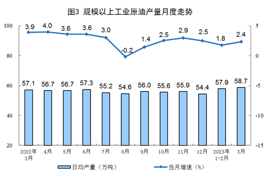 原油生產(chǎn)略有加快,進(jìn)口由降轉(zhuǎn)增。3月份,生產(chǎn)原油1818萬噸,同比增長2.4%,增速比1—2月份加快0.6個百分點(diǎn),日均產(chǎn)量58.7萬噸。進(jìn)口原油5231萬噸,同比增長22.5%,1—2月份為下降1.3%。